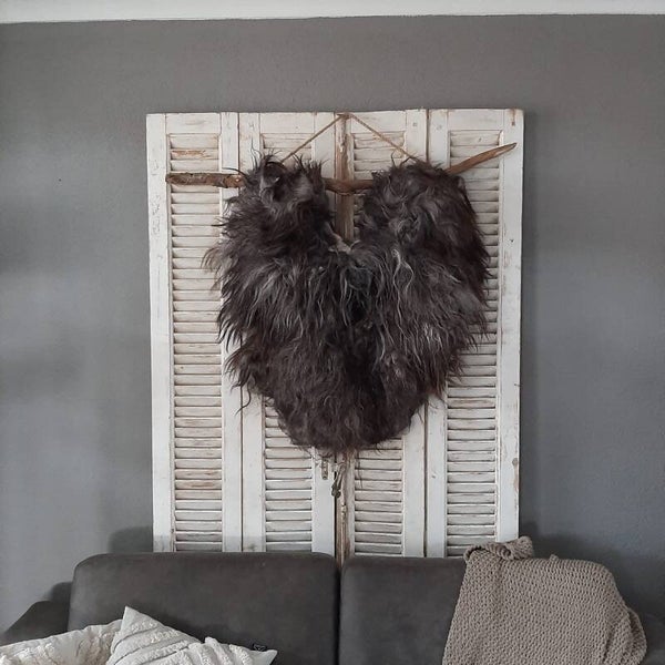 Hele mooie unieke wandhanger. Van natuurlijke schapenvacht. Het schaap loopt nog rond in de wei en de vacht gebruiken we om deze mooie wandhanger te maken. Het is een natuurlijk product dus is uniek!