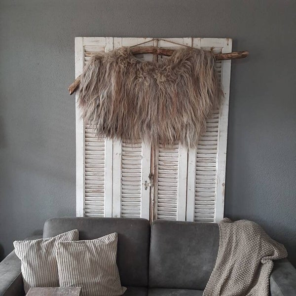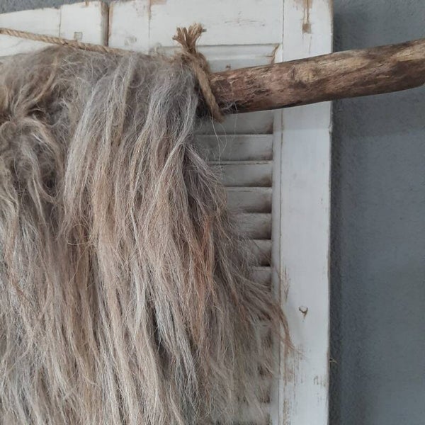 Hele mooie unieke wandhanger. Van natuurlijke schapenvacht. Het schaap loopt nog rond in de wei en de vacht gebruiken we om deze mooie wandhanger te maken. Het is een natuurlijk product dus is uniek!