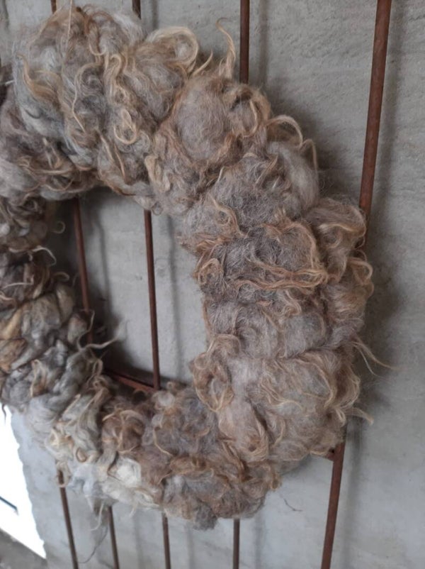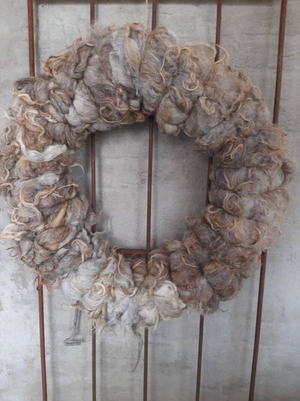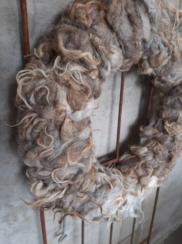 Een hele mooie schapen wol krans van gewassen schapenwol. Het schaap loopt nog rond in de wei en de wol gebruiken we om mooie producten mee te maken.
