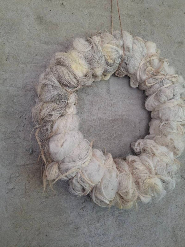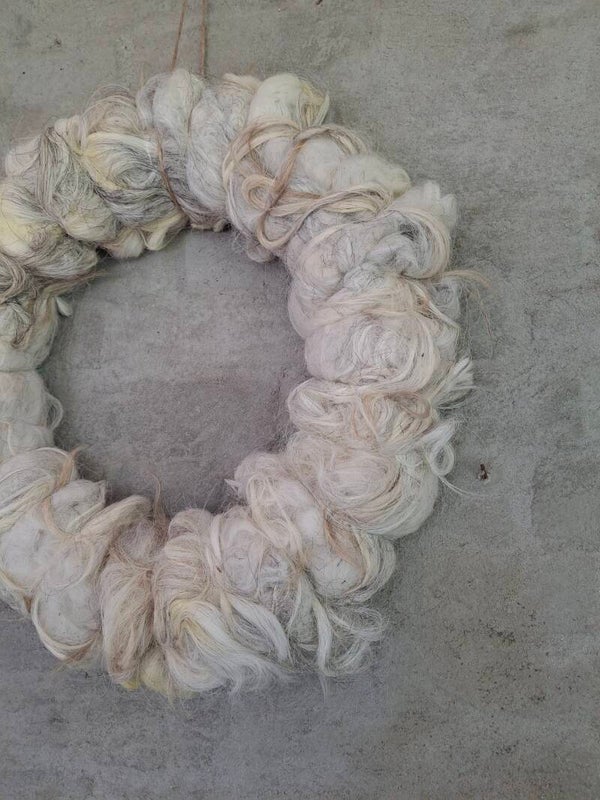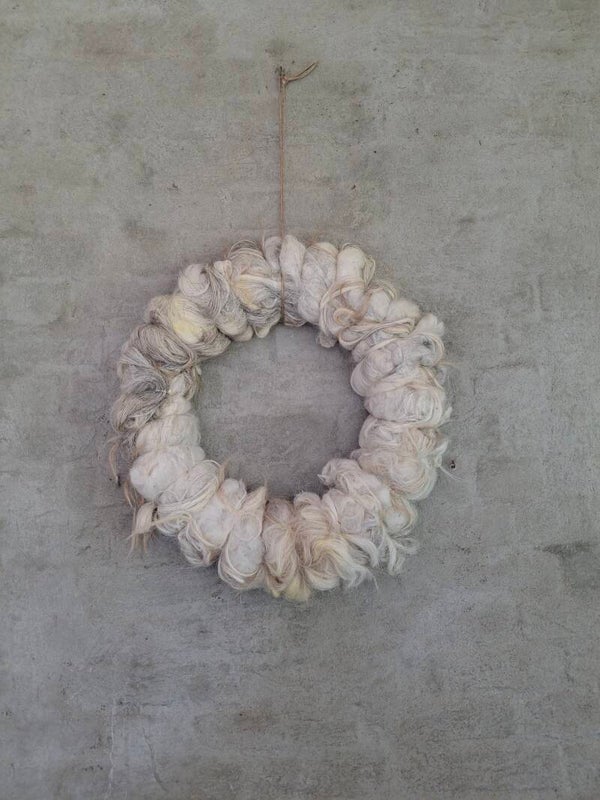 Een hele mooie schapen wol krans van gewassen schapenwol. Het schaap loopt nog rond in de wei en de wol gebruiken we om mooie producten mee te maken.