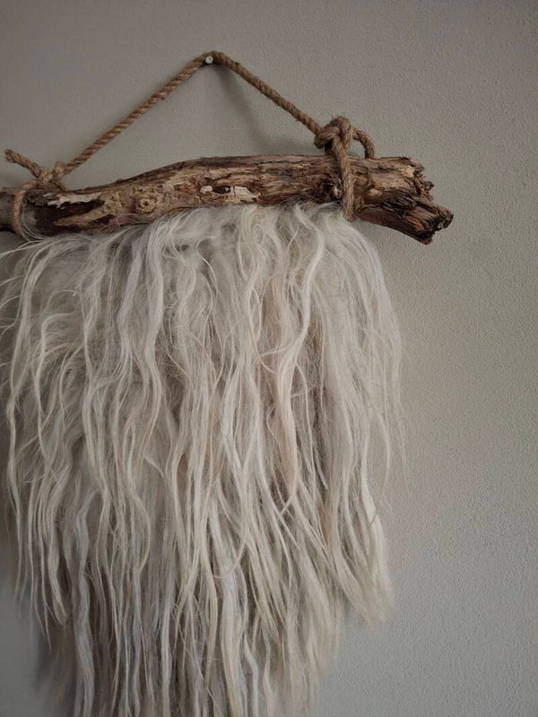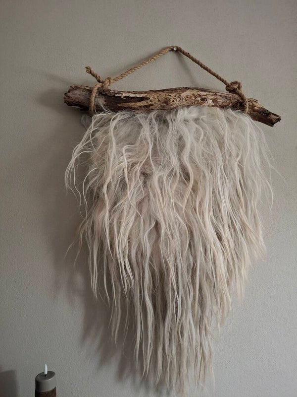 Hele mooie unieke wandhanger. Van natuurlijke schapenvacht. Het schaap loopt nog rond in de wei en de vacht gebruiken we om deze mooie wandhanger te maken. Het is een natuurlijk product dus is uniek!