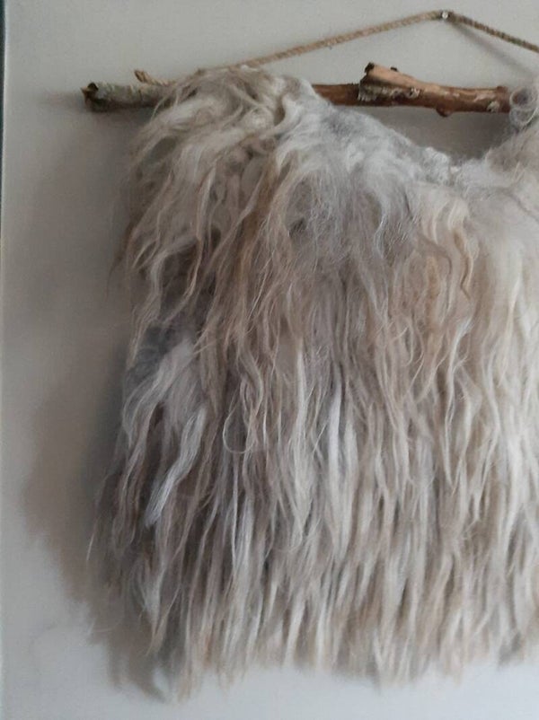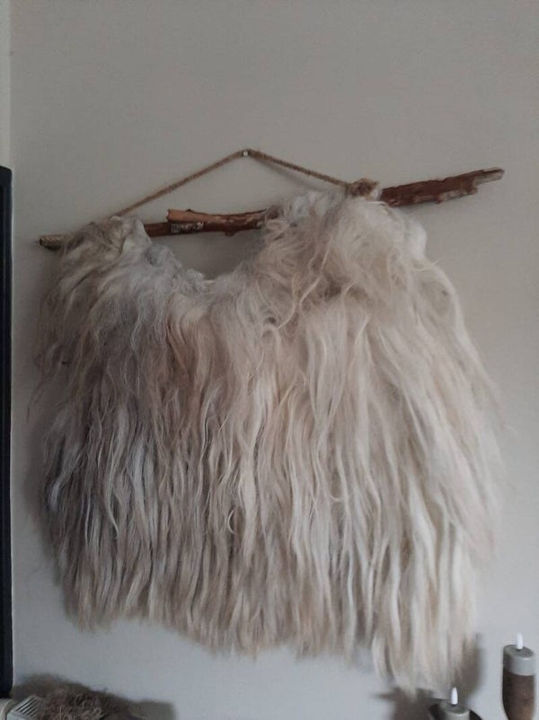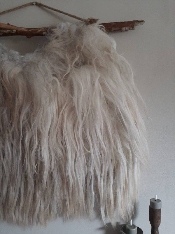 Hele mooie unieke wandhanger. Van natuurlijke schapenvacht. Het schaap loopt nog rond in de wei en de vacht gebruiken we om deze mooie wandhanger te maken. Het is een natuurlijk product dus is uniek!