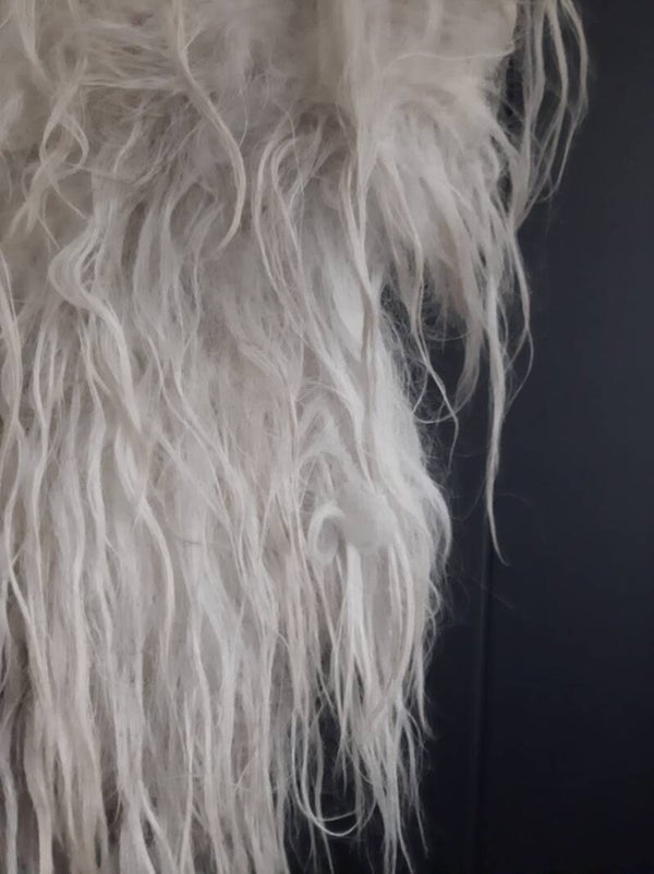 Het is mogelijk dat er nog wat haren van de hanger uitvallen en er nog bijv zand uit komt. De vachten zijn helemaal gewassen dus wel zo schoon als mogelijk. De hanger is bedoeld voor decoratief gebruik.