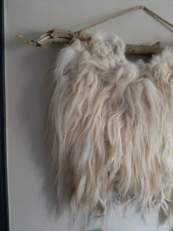 Hele mooie unieke wandhanger. Van natuurlijke schapenvacht. Het schaap loopt nog rond in de wei en de vacht gebruiken we om deze mooie wandhanger te maken. Het is een natuurlijk product dus is uniek!