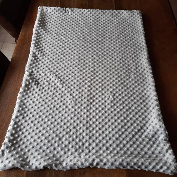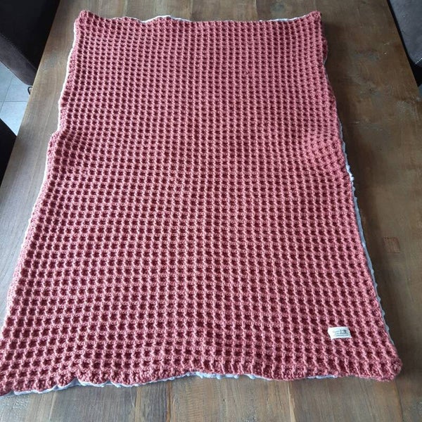 Leuke roze kleurige babydeken. Leuk met de wafelsteek en de grijs gebobbelde stof aan de achterkant.