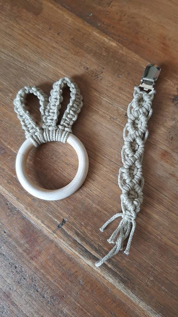 De set bevat 1 speenkoord van +/- 20cm lang en een bijtring met oortjes in 1 kleur.