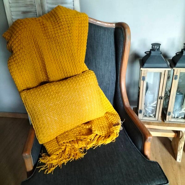Mooie zonnebloemgeel kleurige woondeken en kussen. Staat leuk in je woonkamer of in je tuin. Leuk over de bank of over in tuinstoel. Fijn om bij koude avonden om je heen te slaan en lekker tegen het kussentje aan te kruipen.